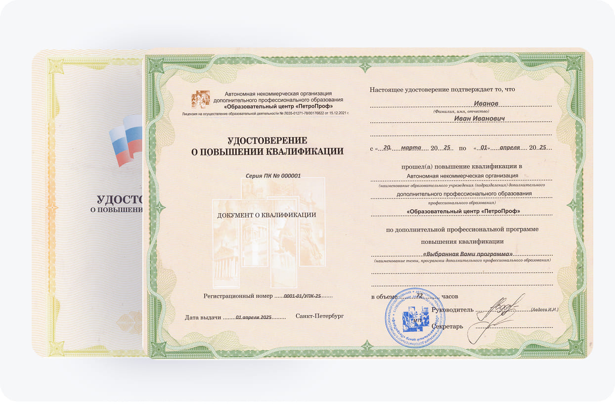 Окончив обучение в нашем учебном центре "ПетроПроф", выпускники становятся обладателями удостоверения о повышении квалификации.